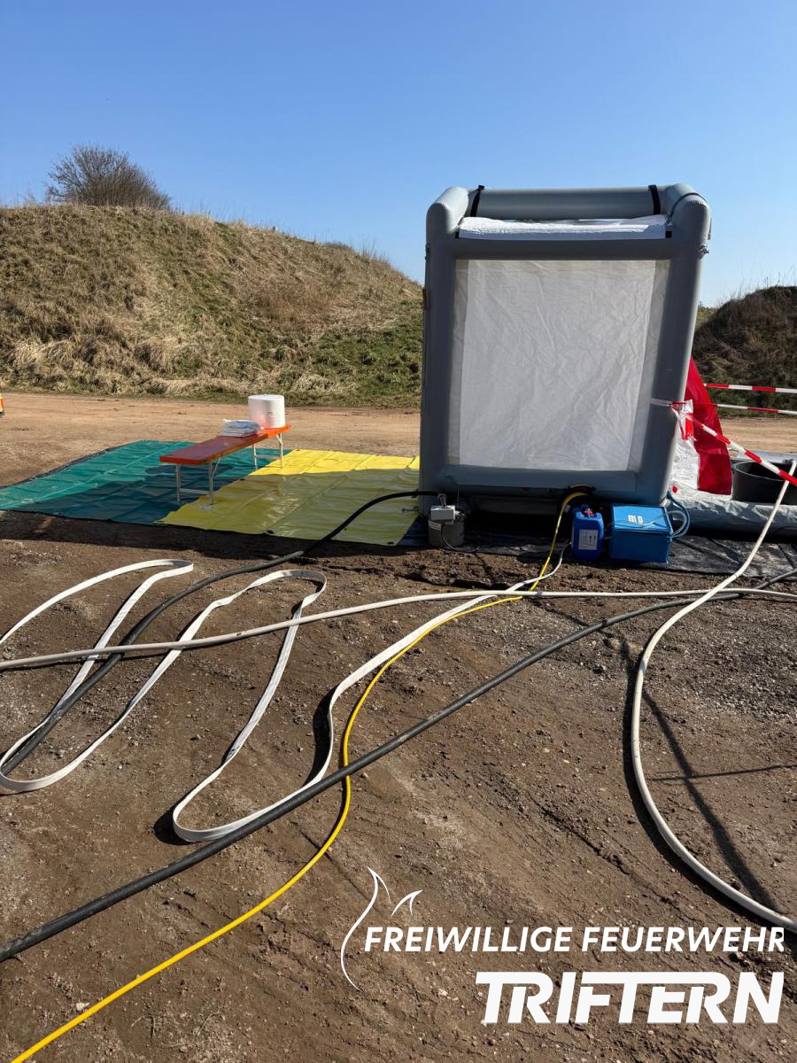 Vor Ort hatte wir die Aufgabe unsere Dusche zur Dekontamination bereitzustellen. Die Gesamtführung im Bereich der Dekontamination übernahm die Feuerwehr Triftern.