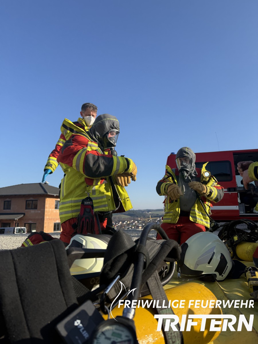Vor dem Mittagessen wurde es dann auch schon das erste Mal ernst, die erste große Übung stand an. In diesem Szenario wurde der Brand eines Dachstuhlbrandes mit Menschrettung aus umliegenden Räumen, sowie das Retten von Personen im verrauchten OG trainiert. Durch unsere professionelle Nebelmaschine wurde aus einem übersichtlichen Dachboden ein Raum mit ca. 50cm Sichtweite. Durch das Vorgehen mit zwei Trupps im sogenannten Zangenangriff konnte dieses Szenario in Rekordzeit abgearbeitet werden. Im Anschluss wurde dann das kontaminationsfreie Entkleiden unserer Atemschutzgeräteträger trainiert und verfeinert, da Einsatzstellenhygiene und zugleich der Schutz unserer Kameradinnen und Kammeraden an höchster Stelle steht.